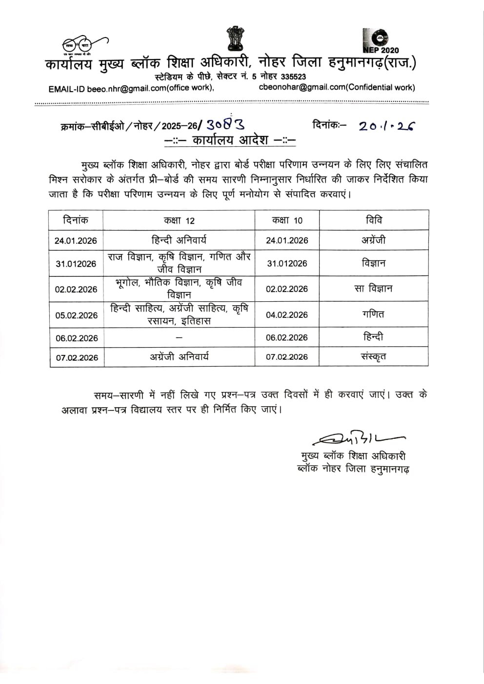 इसके लिए कार्यालय मुख्य ब्लॉक शिक्षा अधिकारी नोहर जिला हनुमानगढ़(राजस्थान) ने बोर्ड परीक्षा उन्नयन कार्यक्रम 2025 सरोकार कार्यक्रम की शुरुआत की है।